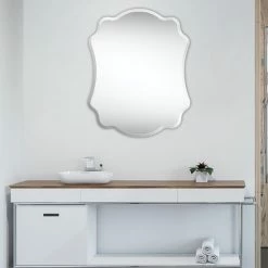 Elevate your interior design with the intricately designed Ashley mirror. The exquisite mirror features an eye-catching symmetrical design with beveled edges to give your room a more sophisticated look. The versatile mirror complements both contemporary and modern decor and blends seamlessly with a wide variety of color pallets. Beveled 24 x 30 mirror has a high quality silver backing. Ready to hang either vertically or horizontally with pre-attached hanging mounts.