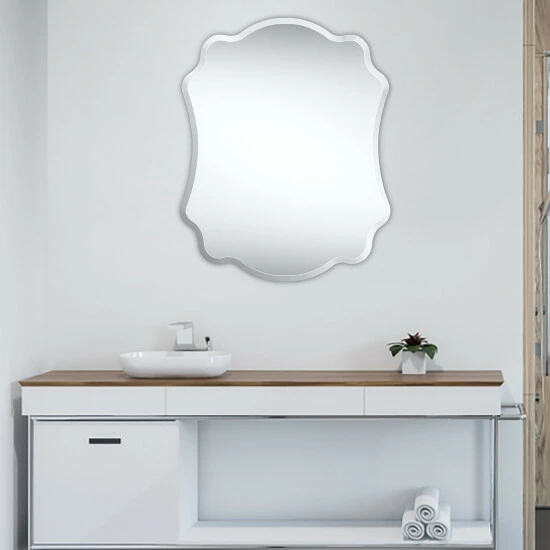 – Beveled glass edges have been cut at an angle to create a framed look and add dimension. This mirror is sure to be the focal point of the room