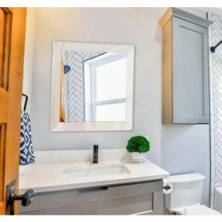 The Dartmouth Square Frame Mirror features a square frame that includes mirrored strips along its edges, creating a contemporary look. Neutral white is always right and its shape allows you to place it anywhere in your house to reflect light. This mirror alone will update your guestroom or bath in a flash! Beveled 19.5 x 19.5 mirror with a high quality silver backing. Ready to hang either vertically or horizontally with pre-attached hanging mounts