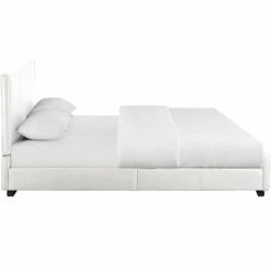 The Hindes Upholstered Platform Bed is the ultimate combination in comfort and style. With a clean & modern look, the Hindes Bed is a sleek and sophisticated addition to any bedroom. The upholstered headboard, accented by the low profile footboard-style frame, provides an elegant chic to the design. With this platform bed, no box spring is needed though can be used based on your mattress height preference. A complete slat system extends the life of your mattress. Don’t be fooled by other beds with 4 or 5 slats and expect the mattress not to sag. The 14 euro slats are properly spaced to provide full coverage and maximum support. Takes any standard mattress.