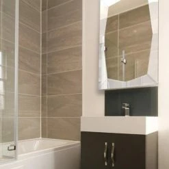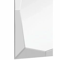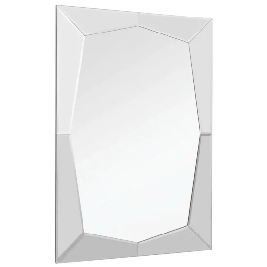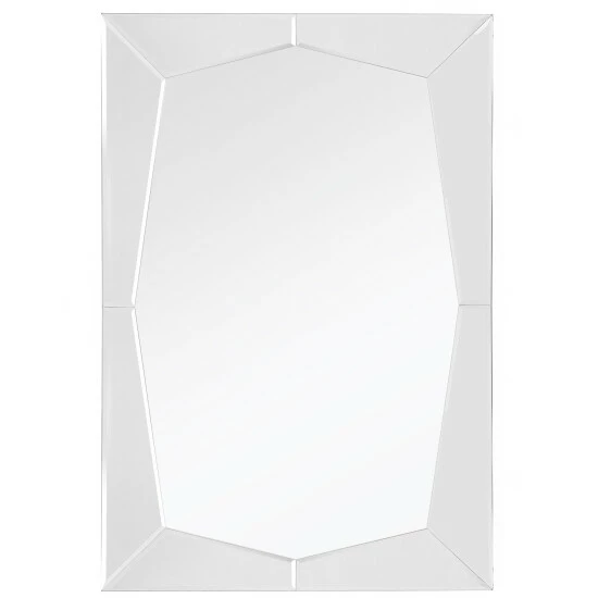 The queen etched beveled bathroom/vanity mirror has a unique geometric border, generating reflections from all angles, without a traditional frame. Its minimalist lines are ideal to place near a window, allowing the natural rays to reflect into your room. Hang this decorative wall mirror by a door or place two with contemporary sconces, making it easy to check your appearance as you walk by.Beveled 24 x 36 mirror with a high quality silver backing. Ready to hang either vertically or horizontally with pre-attached hanging mounts.