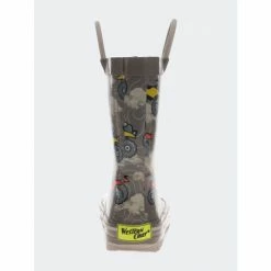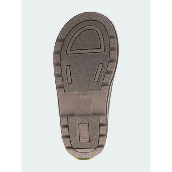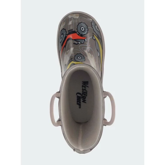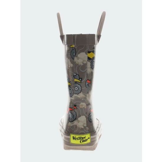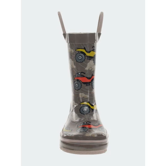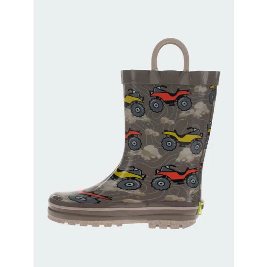 Brown waterproof rubber boots for kids with a yellow and orange 4-wheeler print. Light brown outsole and pull handles compliment this signature print. Polyester cotton blend lining with a removable insole. Boots are easy to clean after a day of play.