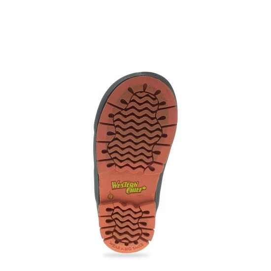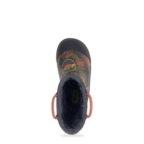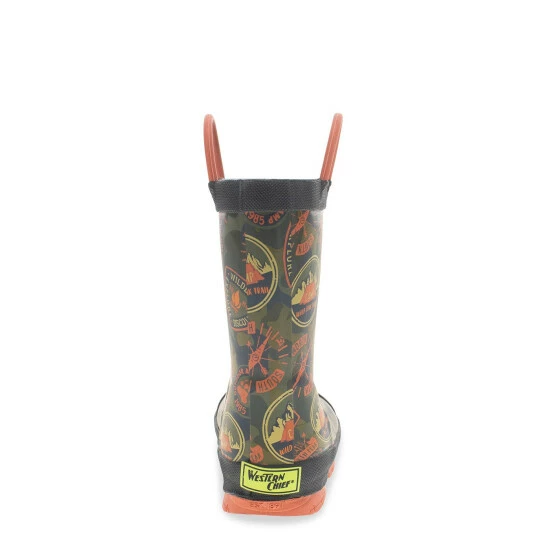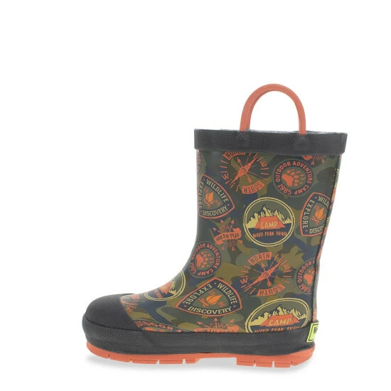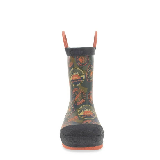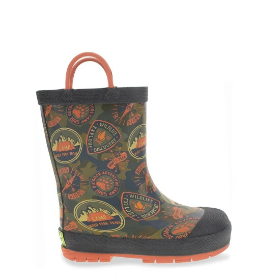 Kids all-natural rubber rain boot in camping adventure camo print. Easy on/off dual side pull handles in bold orange and signature removeable puzzle pairs insoles promotes self dressing. Traction mini lug out sole in black. Reinforced durable black toe-cap. Cozy soft moisture-absorbent polyester cotton blend lining for warm dry little feet. Quick to clean.The boots typically run slightly large to accommodate weather appropriate socks. However, the garden clogs, slippers, or other non-rain boot items run true to size.The process of making handmade boots involves mixing limestone and rubber to give the footwear its form. It’s natural for quality rubber to develop a white film, called blooming and it’s easy to clean.
