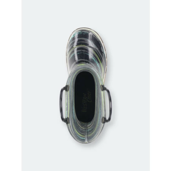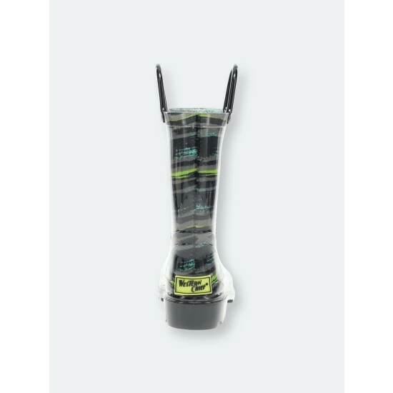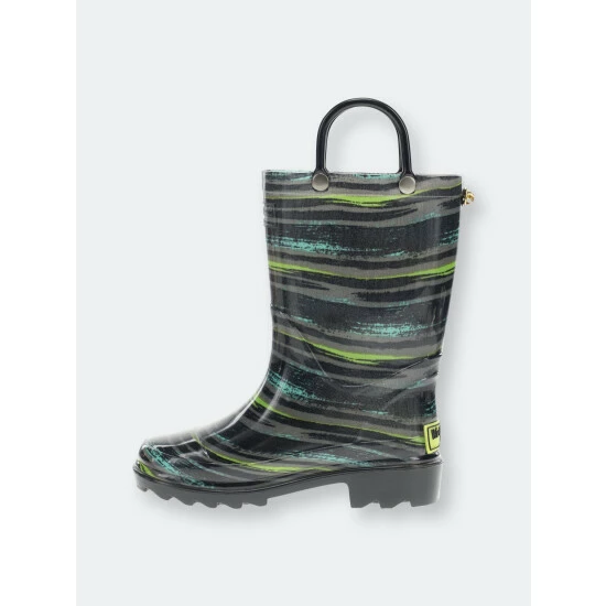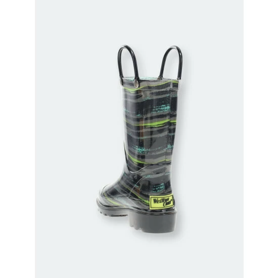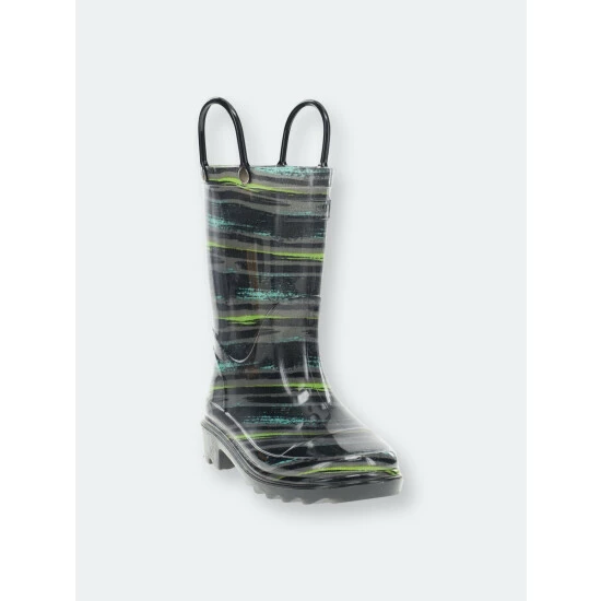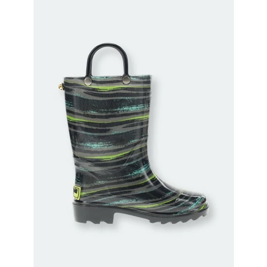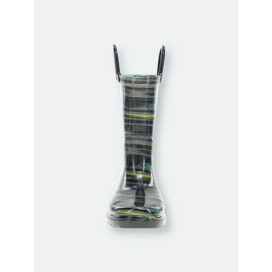 Gray, green, and teal striped rain boots. Black outsole and pull handles compliment this eye-catching print. These boots light-up with every step adding to the fun and provide an element of safety during play. Completely waterproof and easy to clean after a day of play.