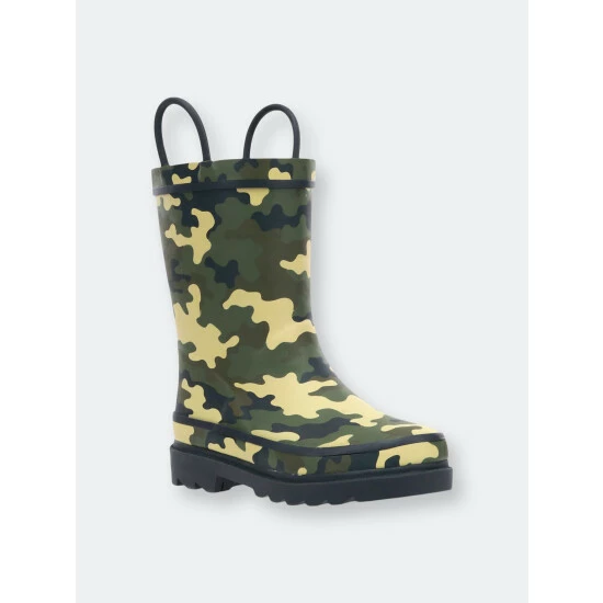 Green and charcoal camo boots for outdoor puddle stompers. A Western Chief rain boot with camo print and charcoal trim that’s perfect for girls and boys. Easy pull on handles make is quick and easy to get out the door when getting dressed.Western Chief has been making trusted family footwear since 1891. All products are handmade with the intent of keeping the wearer dry and comfortable in unpredictable weather.