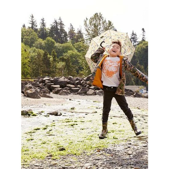 Western Chief kids’ traditional green camo print that is ready to take on any muddy play day! Camo umbrella is child size and lightweight. Don’t forget the matching coat and rain boots!
