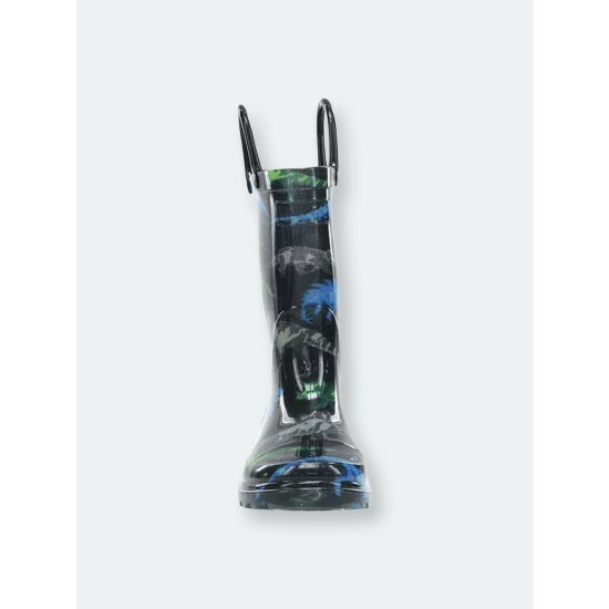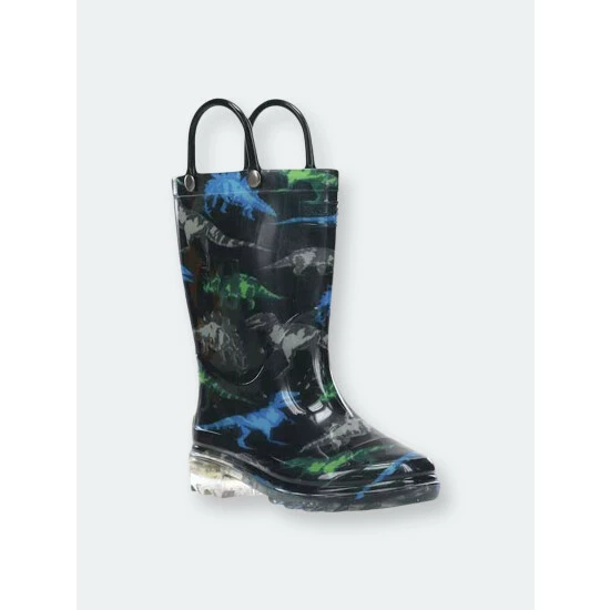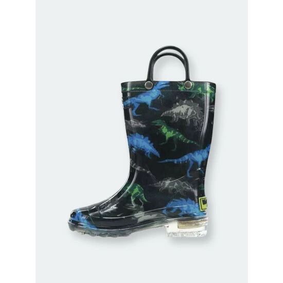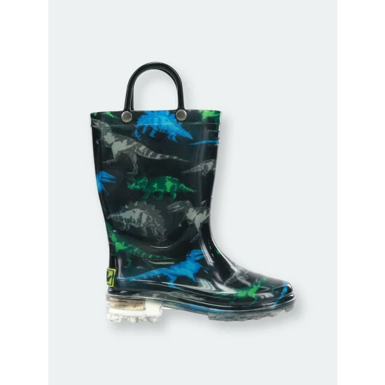 Three prehistoric dinosaur species in blue, gray, and green on a dark canvas. Strong, ferocious, and ready to stomp! Waterproof boots that light-up with every step, making them fun and an added safety feature for outdoor play.