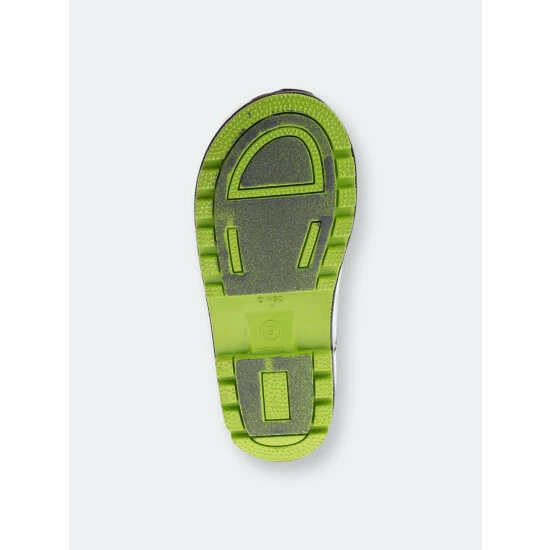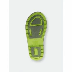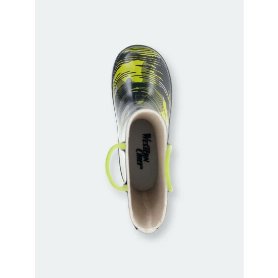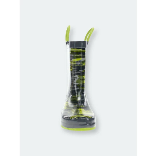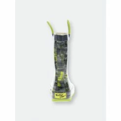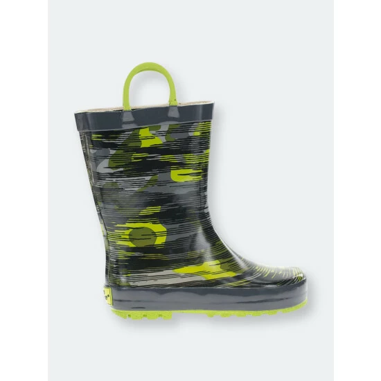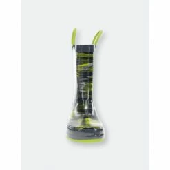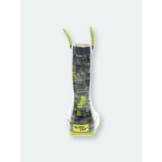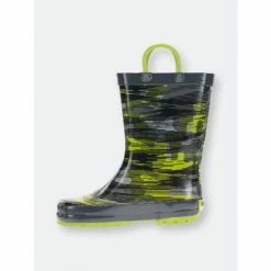 A modern camo print with geometric lines. Gray, black, and bright green. Green outsole and pull handles frame this vibrant print.