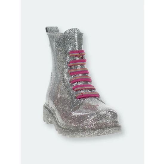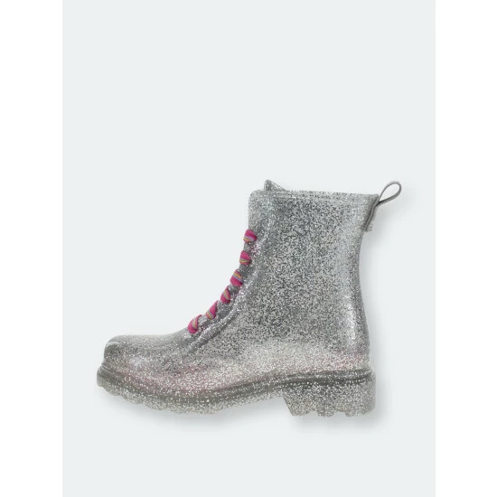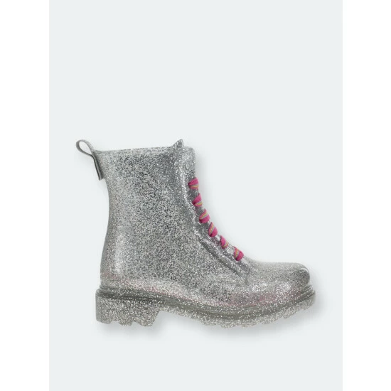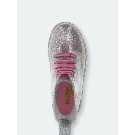These boots are full of personality. Waterproof silver glitter combat boots. Pink glitter elastic laces and silver glitter lug outsole. Back heel loop helps with pulling boots on. Polyester lining and removable EVA insole.Western Chief has been making trusted family footwear since 1891. Our products are designed in Kent, WA and manufactured in China. All products are handmade with the intent of keeping the wearer dry and comfortable in unpredictable weather.