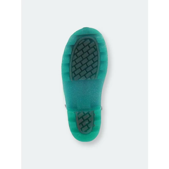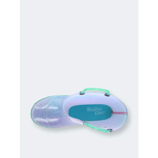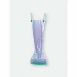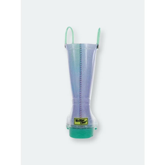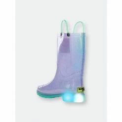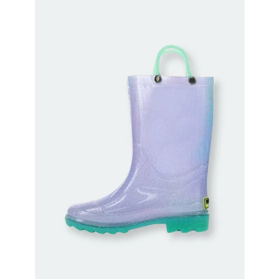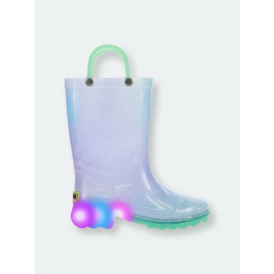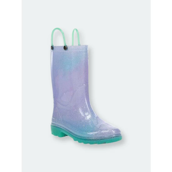 A cute light up rain boot for girls with two pull handles, purple and blue ombre coloring, and teal outsole. Glittery overtone is cute without the mess! Your little girl will love jumping in puddles in these great rain boots.