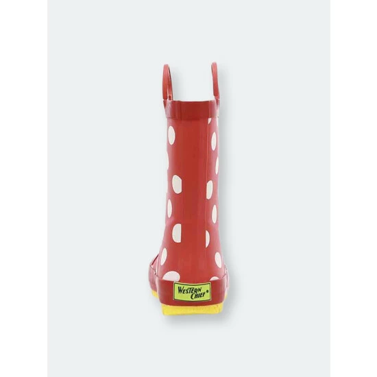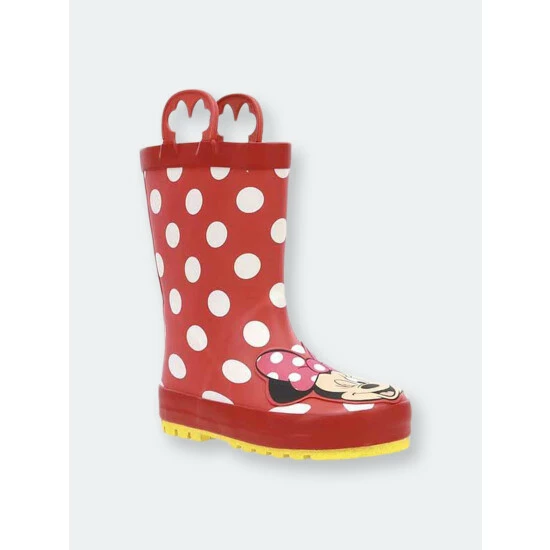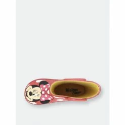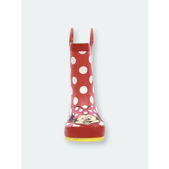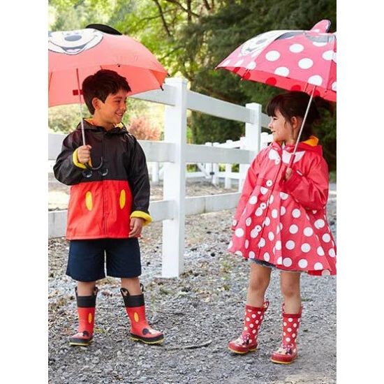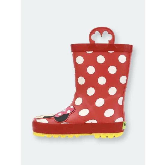 Polka dots and Minnie Mouse prominently displayed on the toes. Matching licensed rain coat and umbrella to complete the look.