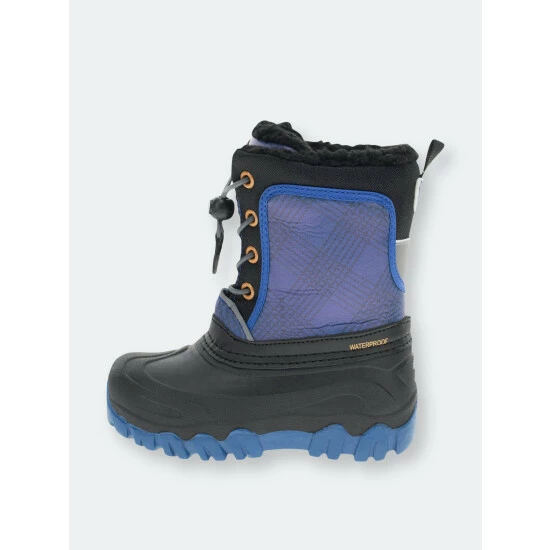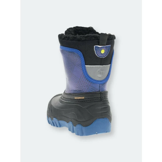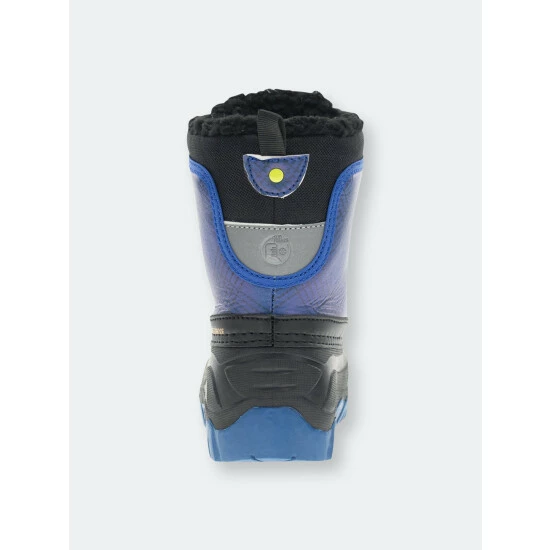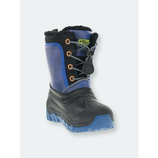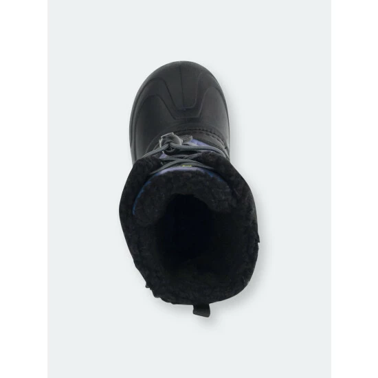 Waterproof and warm winter snow boots in black with a blue print and outsole. An adjustable toggle closure for a secure fit. Soft faux fur lining and reflective trim for added safety. These boots are made for sub-freezing temperatures.- Waterproof shell with lug outsole- Reflective trim- Removable adjustable toggle closure- Faux fur lining and insole- Built for sub-freezing temperatures- Western Chief has been making trusted family footwear since 1891. Our products are designed in Kent, WA and manufactured in China. All products are handmade with the intent of keeping the wearer dry and comfortable in unpredictable weather.