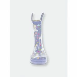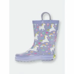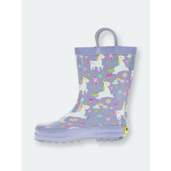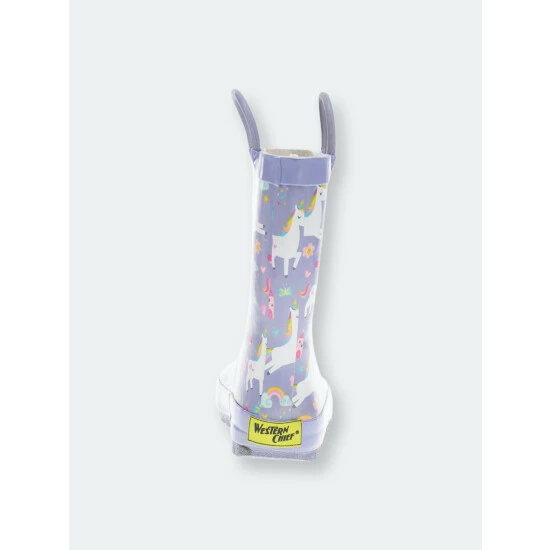 Light purple waterproof rain boots for kids. White unicorns with hearts, stars, and a castle fit for a princess.