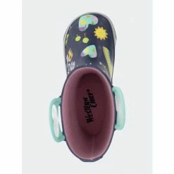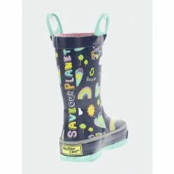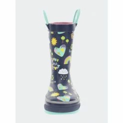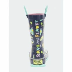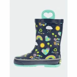 Navy waterproof rain boots with a colorful print of hearts, rainbows, and suns. Teal blue looped handles with heart shaped cut-outs and teal outsole. Back of boot has a “Save our planet” message in multi-colors. Polyester cotton blend lining with a removable insole. Boots are easy to clean after a day of play.