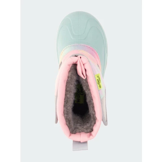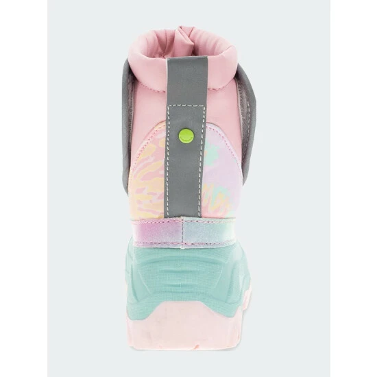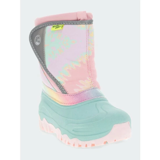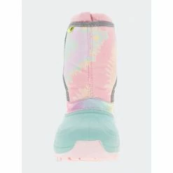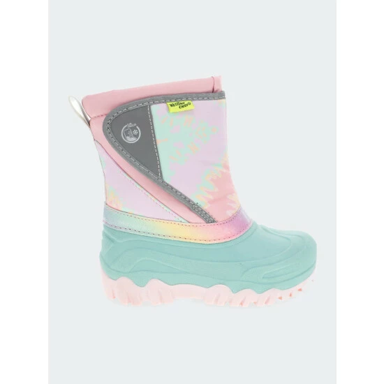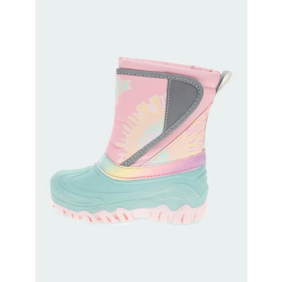Western Chief kids sub-freezing cold-rated waterproof snow boots are ready to sparkle and shine on snow days! Sherbet pastel tie dye swirls with sparkly pink glitter trim detailing. Designed for little hands to independently and easily grab, adjustable full-shaft hook ‘n loop closure flap allows for an adjustable and secure fit. Extended reinforced toe cap provides extra coverage and protection. Faux-fur EVA lining for extra padded cozy warmth. Extra gripping, durable textured no-slip traction weather-resistant lug outsole in icy aqua and tranquil lavender. Coordinated silver grey reflective exterior trim detailing and back ankle pull tab for easy on/off.