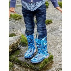 Sharks swimming fiercely among the deep sea. Boots light-up with every step as kids splash through puddles! The lighted heel flashes with every step making it great for fun and an added safety feature in the dark.