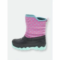 Waterproof and warm winter snow boots in pink with teal blue polka-dots. Easy to slip-on with a hook and loop closure. Soft faux fur lining and reflective trim for added safety. These boots are made for sub-freezing temperatures.