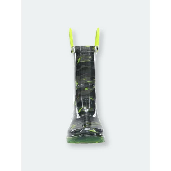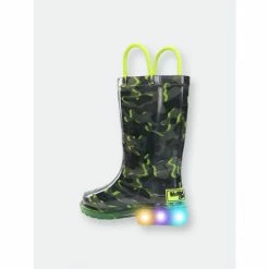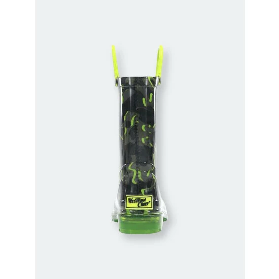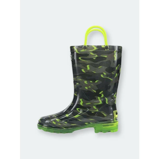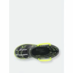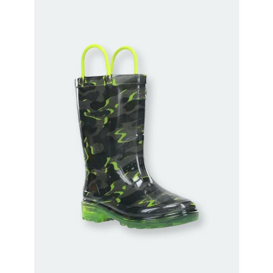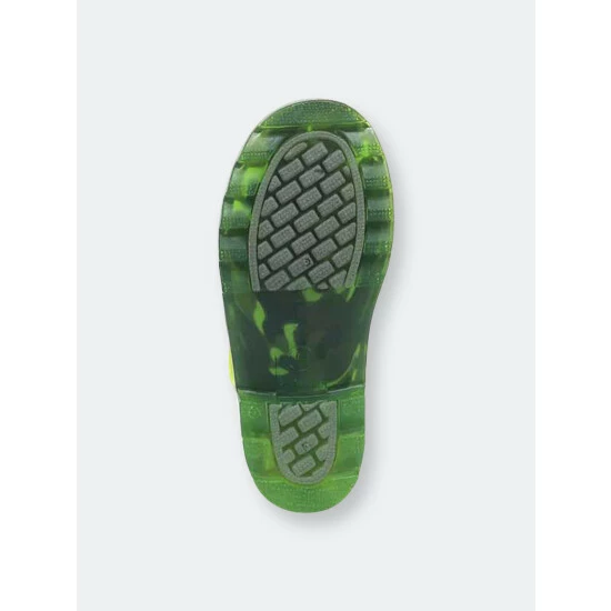 A monochromatic camo print with pops of green intertwined. Bright green handles and outsole compliment the lights that flash with every step.- 7″ Height- Polyester Lining- PVC lighted rain boots- Slip-resistant lug outsole- Removable EVA insole- Full action lights