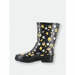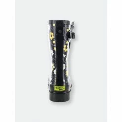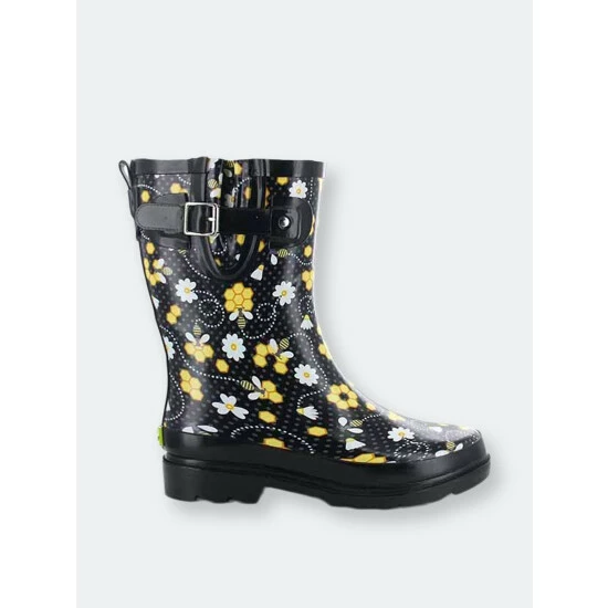 Mid-height, completely waterproof rain boot for women in black. Adorable print features cute bees buzzing by white and yellow flowers. Decorative buckle detailing with pull tab for easy on, easy off. Great for keeping feet dry and making smiles. Western Chief has been making trusted family footwear since 1891. All products are handmade with the intent of keeping the wearer dry and comfortable in unpredictable weather.