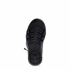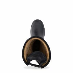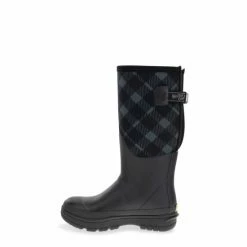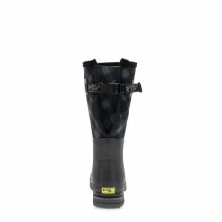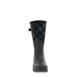 Black waterproof winter boots. Black rubber base with an insulated neoprene upper and memory foam insole. Neoprene features a black and gray plaid print. These boots are made for wide and athletic calves. The back gusset expands with an adjustable buckle. Boots are easy to clean after a day outdoors.