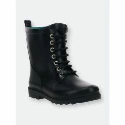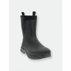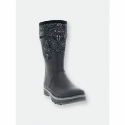 Black waterproof winter boots. Black rubber base with an insulated neoprene upper and memory foam insole. Neoprene features a black and gray plaid print. These boots are made for wide and athletic calves. The back gusset expands with an adjustable buckle. Boots are easy to clean after a day outdoors.