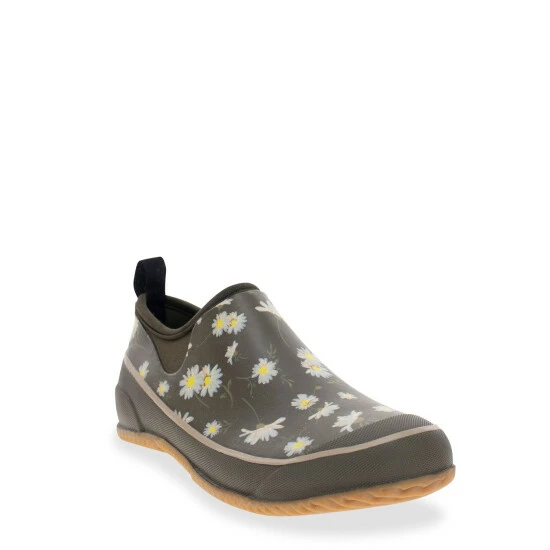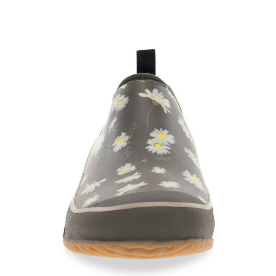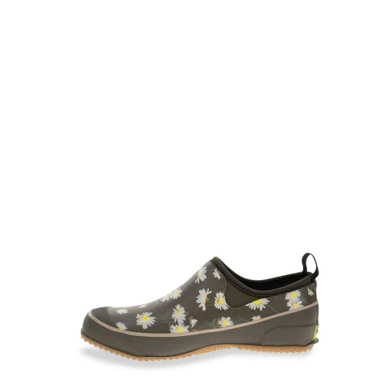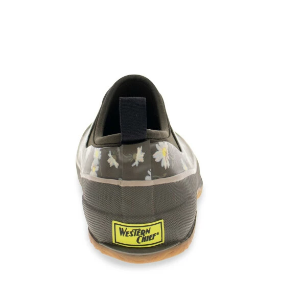 Olive green waterproof step-in ankle rain shoes with a white wild daisy floral print. Insulated with neoprene lining to keep feet warm in cold temperatures. Protective and easy to clean.Western Chief has been making trusted family footwear since 1891. All products are handmade with the intent of keeping the wearer dry and comfortable in unpredictable weather.