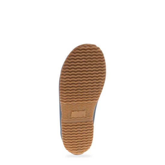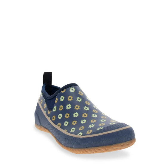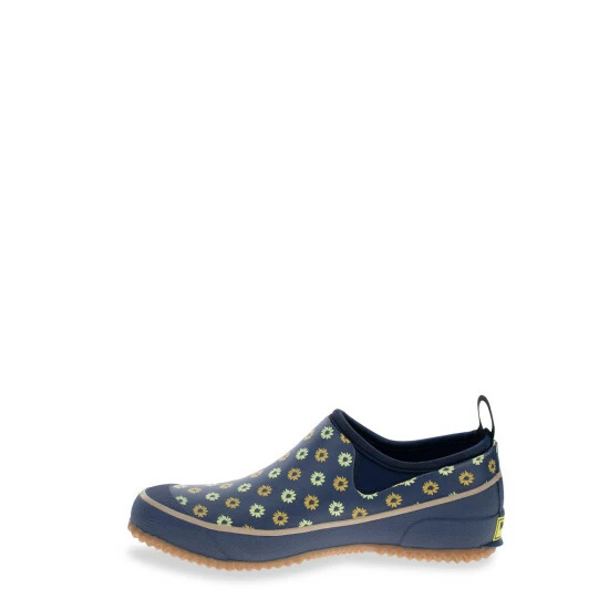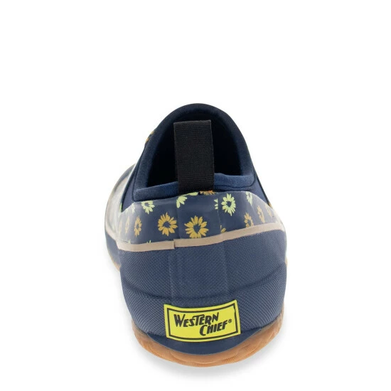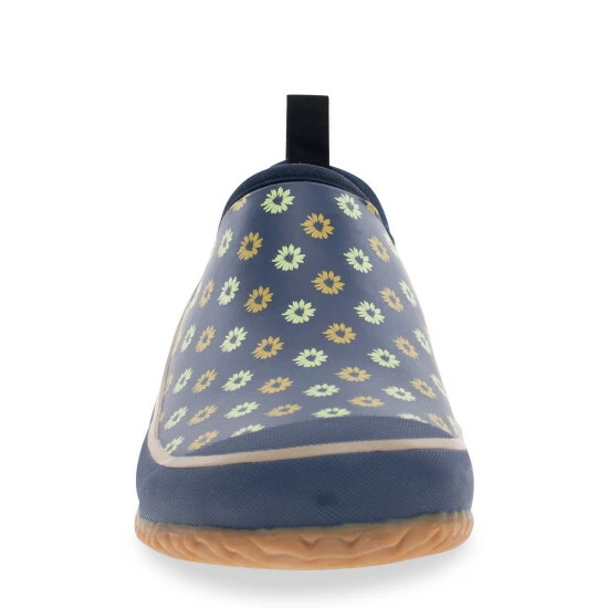 Navy blue waterproof step-in ankle rain shoes with yellow and off-white daisy floral print. Insulated with neoprene lining to keep feet warm in cold temperatures. Protective and easy to clean.