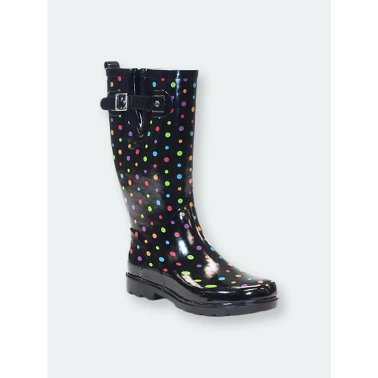 Women’s waterproof rain boots in black with multi-colored polka-dots. This classic print is a popular boot among women. Pairs nicely with a variety of outfits in spring or fall.Western Chief has been making trusted family footwear since 1891. All products are handmade with the intent of keeping the wearer dry and comfortable in unpredictable weather.