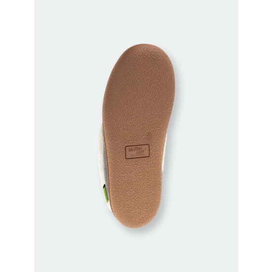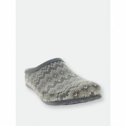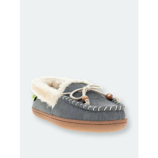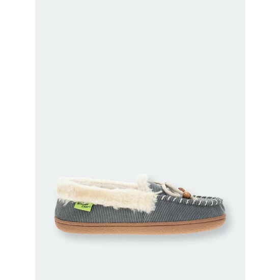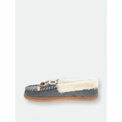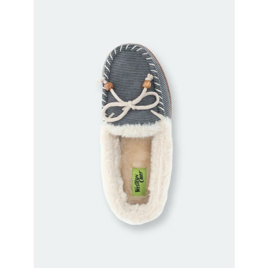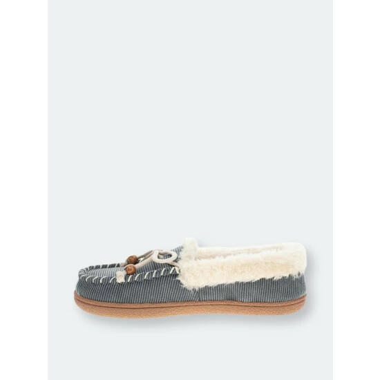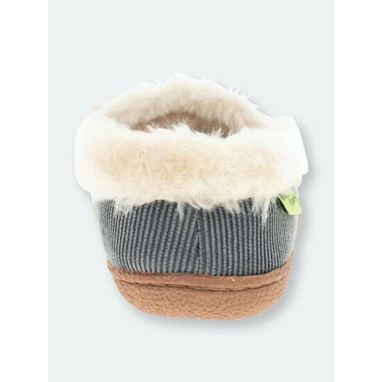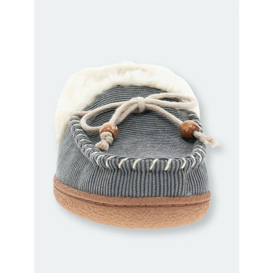 Moc slip-on slippers with a warm lining and collar. Classic styling with gray corduroy a delicate bow on top.
