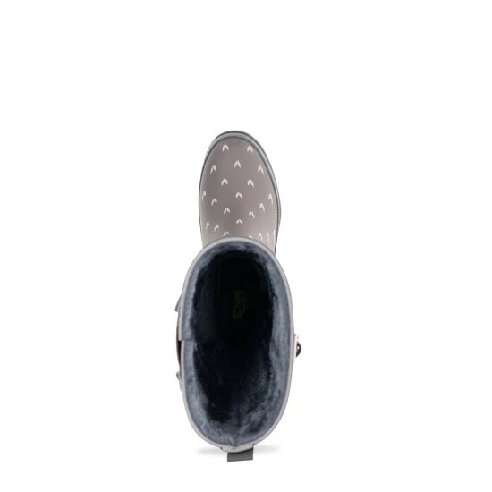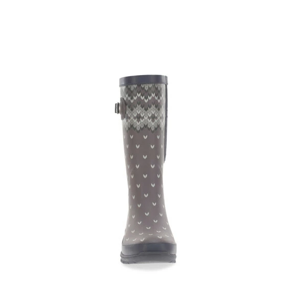 Light brown boots with an off-white sweater print. Taupe outsole and top trim frame this print and a side buckle for added detail. Inside is lined and have a back pull loop. Boots are easy to clean, just rinse or wipe dirt off.