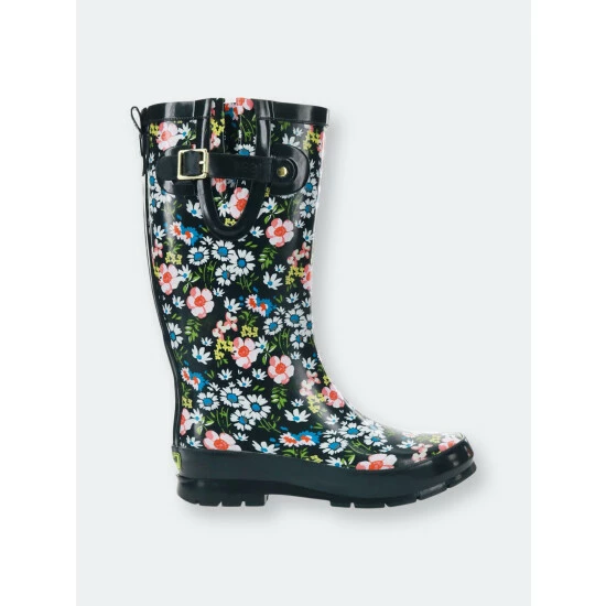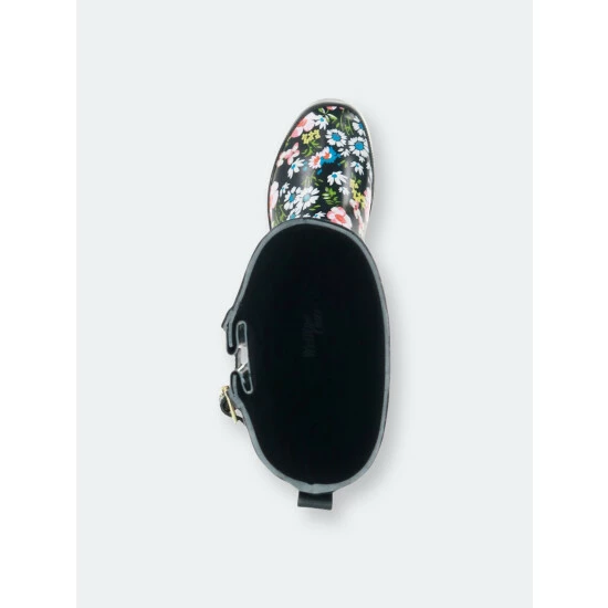 Black waterproof rain boots with a pink and blue floral print. Black outsole and silver side buckle compliment the pretty print. Boots are lined for added comfort with a removable insole. These boots are easy to clean, just wipe or rinse off dirt after a day outside.Adjustable side silver buckleRemovable insoleHandmade waterproof construction with natural rubberMoisture-absorbent polyester cotton blend liningWestern Chief has been making trusted family footwear since 1891. All products are handmade with the intent of keeping the wearer dry and comfortable in unpredictable weather.