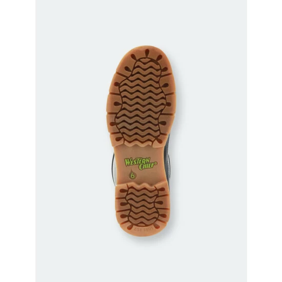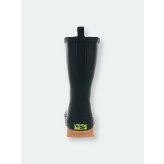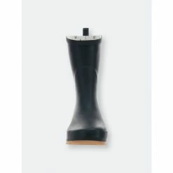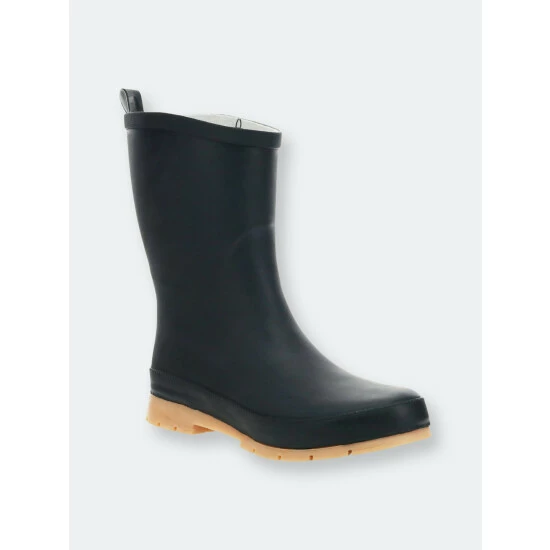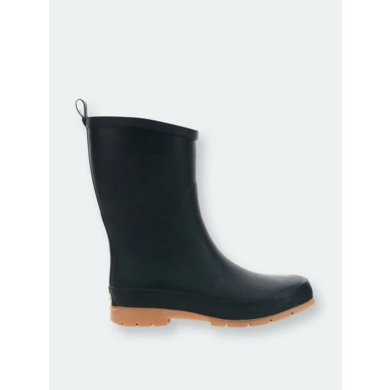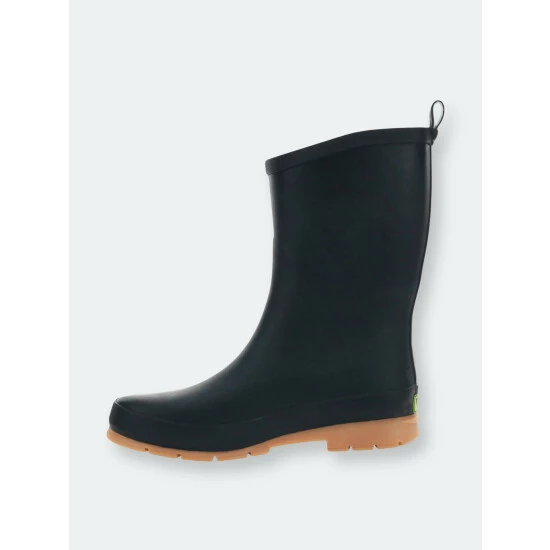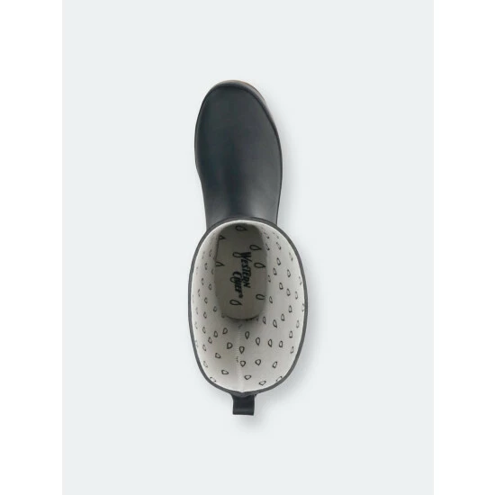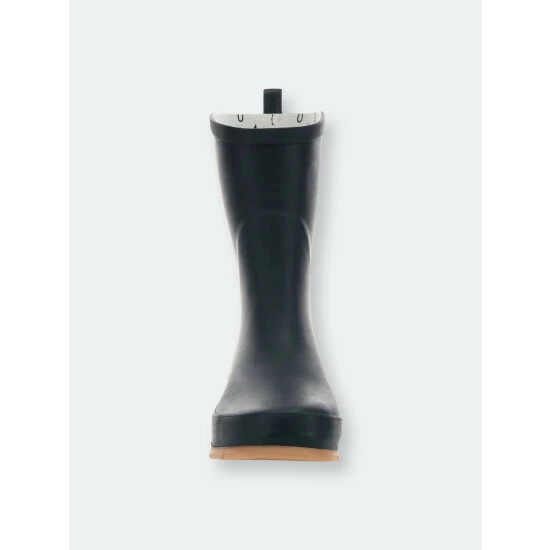 Classic boots with modern styling. Mid-height rain boots in black with a smooth matte finish. Traction outsole in light brown. Boots are completely waterproof and have a rain drop print lining that helps keep feet comfortable.