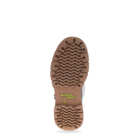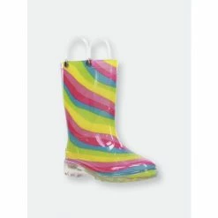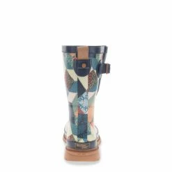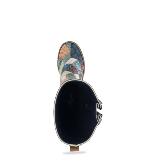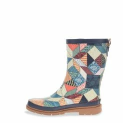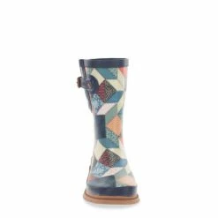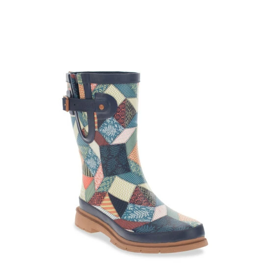 Mid-calf waterproof rain boots for women. Navy blue boots with a patchwork print in blue, purple, pink, and off-white. Side gusset with adjustable buckle. Boots are easy to clean, just rinse or wipe dirt off.