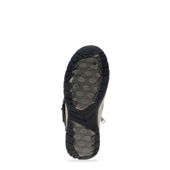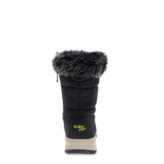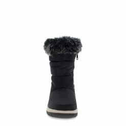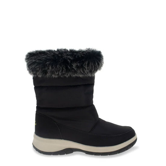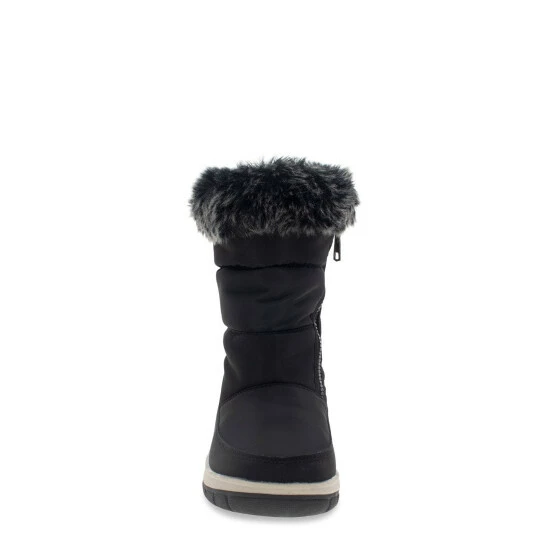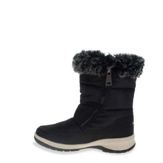 Mid-height cozy cold-weather water resistant PU and nylon puffy boot in black. Soft grey faux fur lining and comfortbale memory foam faux fur insole with gripping TPR outside. Easy up side zipper and adjustable gusset for an adaptable fit.
